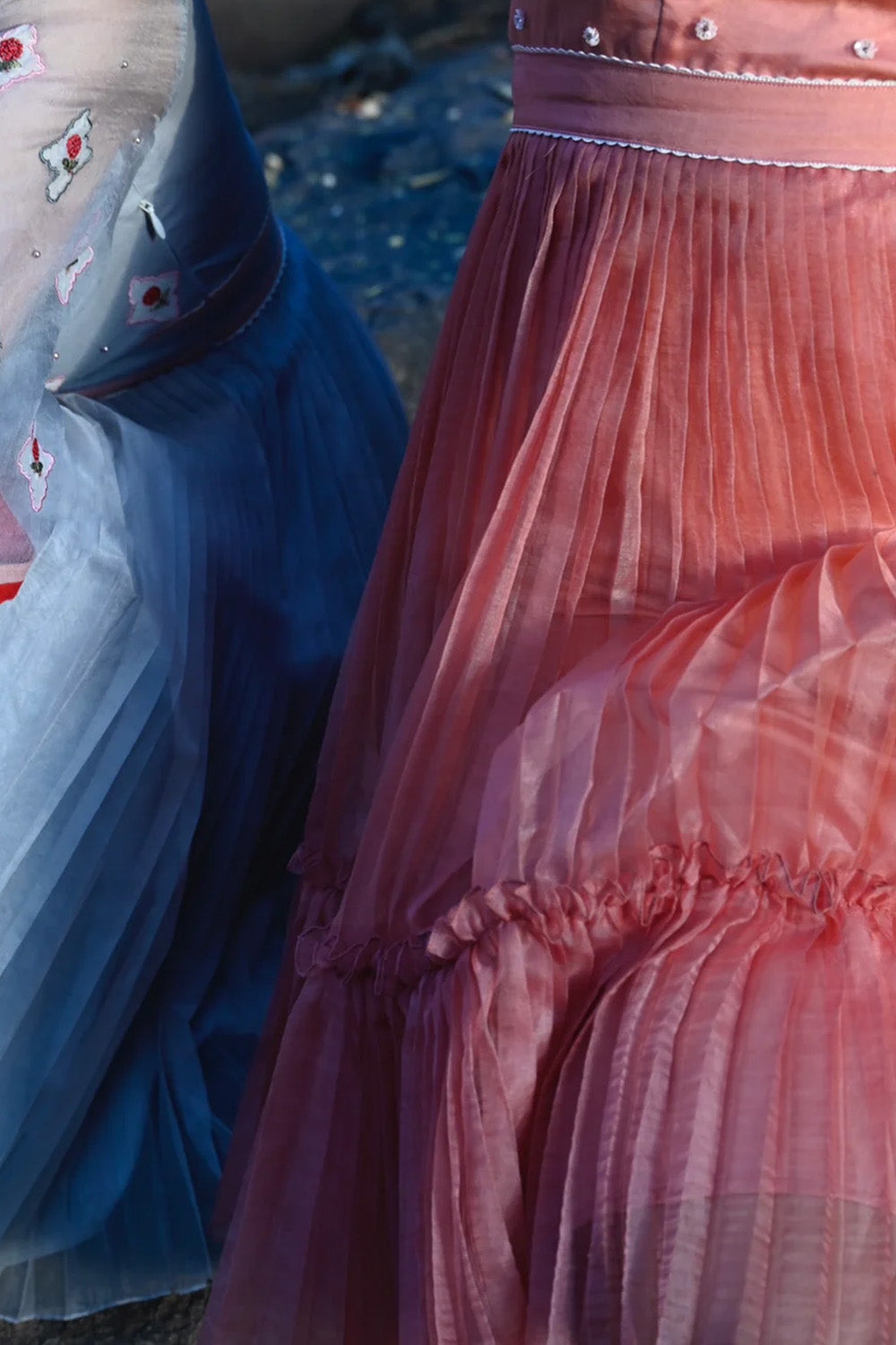 An elegant buta embroidered and pleated knee length dress in a pastel blush pink color.