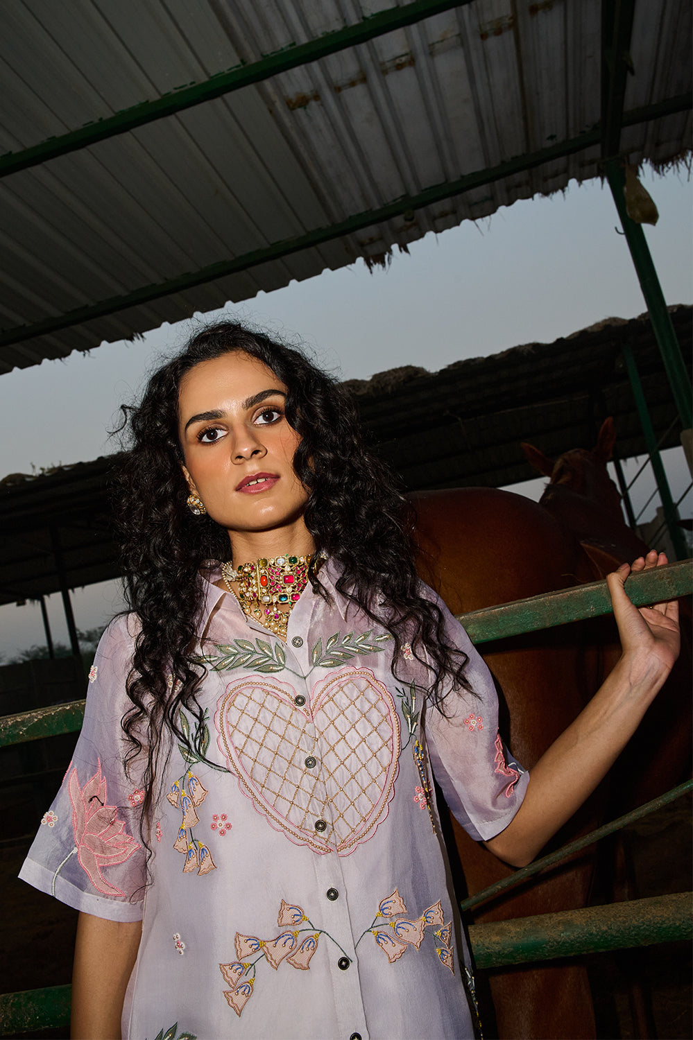 An airy cream organza shirt dress adorned with delicate floral embroidery, designed for effortless elegance. Featuring a classic collar, button-downfront, and relaxed silhouette, this piece blends structure with softness. It comes with a matchingslip dress underneath and a coordinating waist belt, offering comfort, versatility, and a softly defined silhouette — perfect for seamless day-toevening wear.