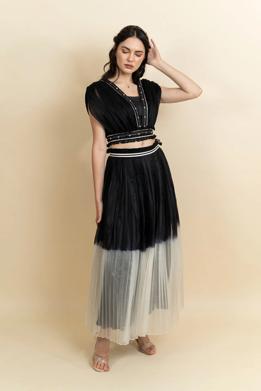 A narrow pleat draped and hand-detailed organza top, a bustier underneath paired with an ombre pleated organza skirt.