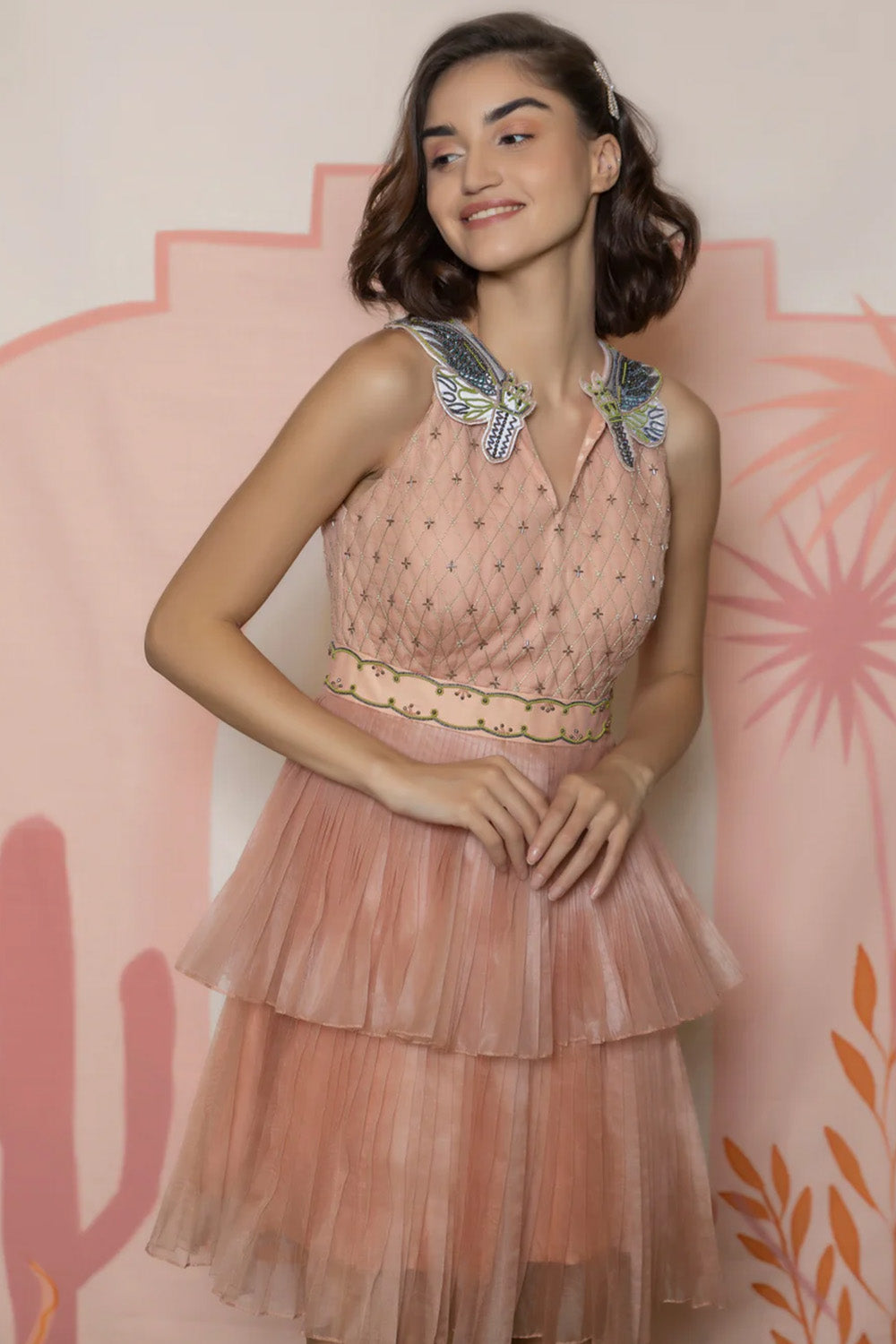 A fully embroidered bodice, with a complementing collar complete with a two-layered organza pleated skirt in a short knee length dress.