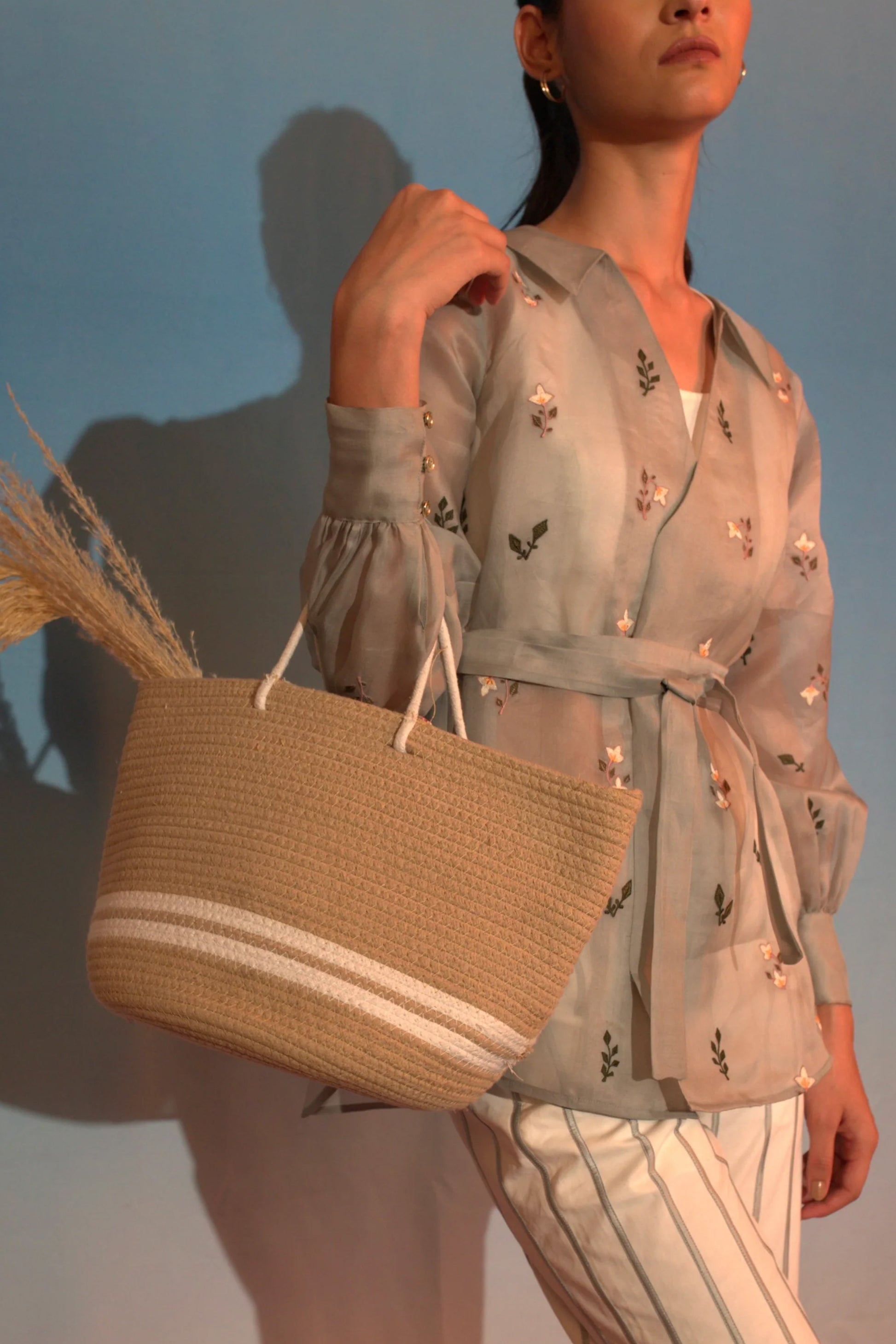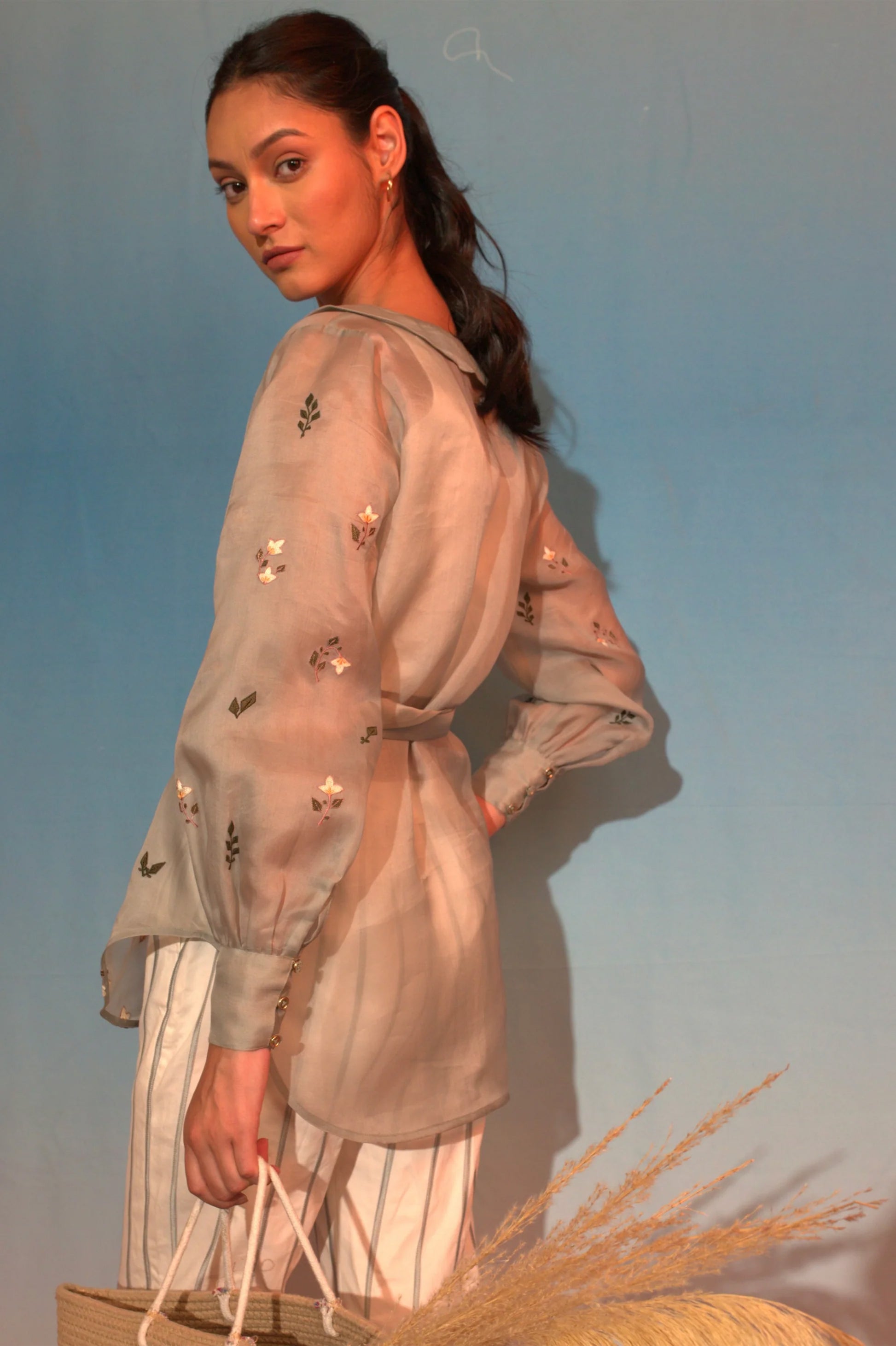 An outfit of sublime sophistication with our floral satin thread embroidered slate grey organza shirt, complete with a wrap-around organza belt, bishop sleeves with broad cuffs, paired with contrasting off-white satin stripe straight fit trousers and an off-white bustier underneath.