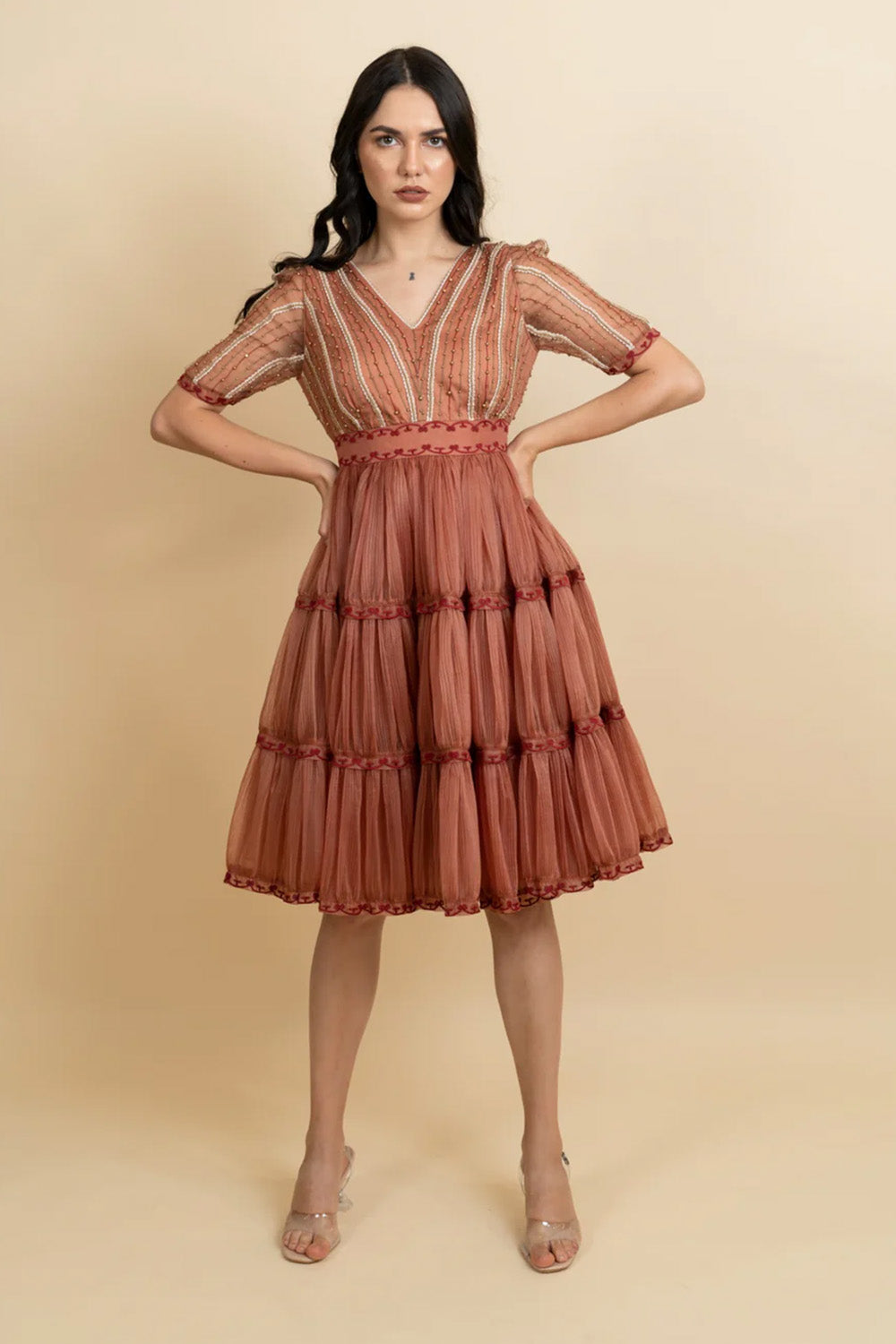 A fully embroidered bodice with fine golden galaxy beads and a 3 layer narrow pleated skirt in a knee-length dress.