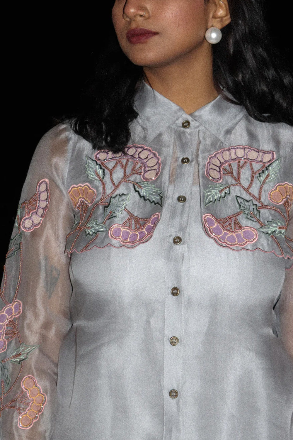 A classy organza dress adorned with a grape-embroidered bodice and sleeves, perfectly complemented by a chic tie-around belt.