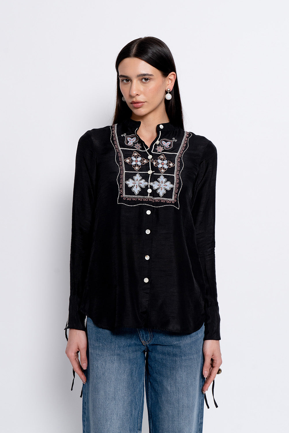 Black silk embroidered shirt with refined front panel detailing.
