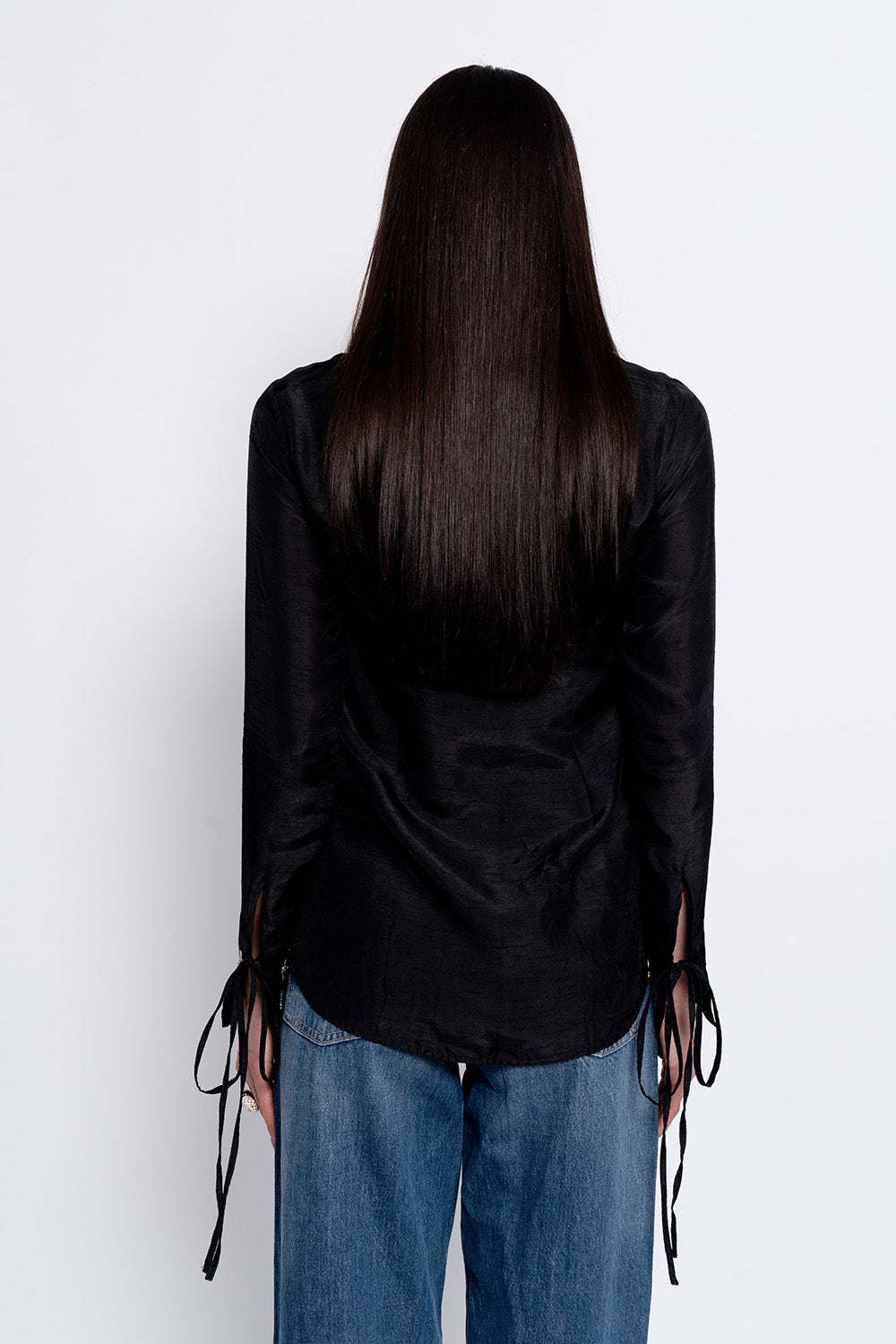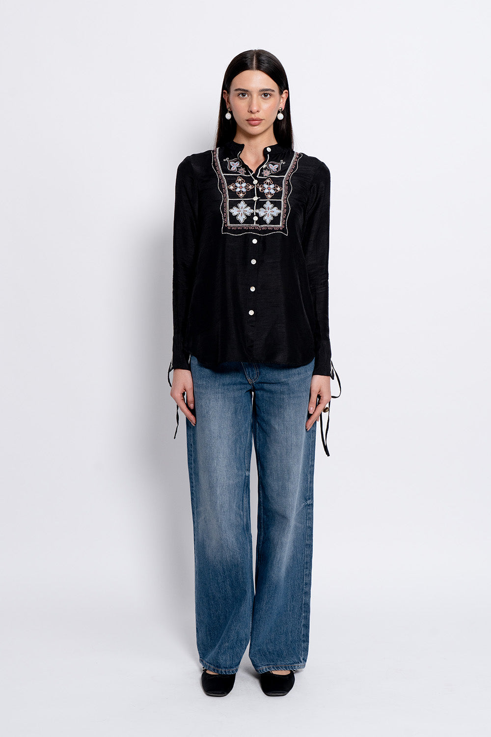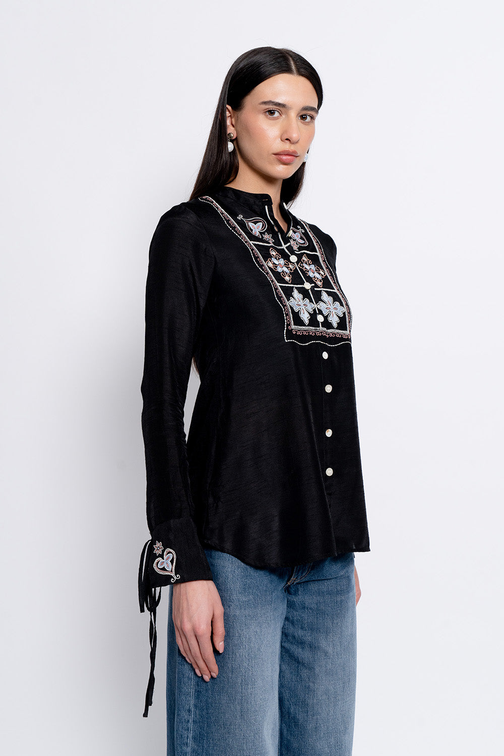 The Ivara Top is crafted in black silk and adorned with intricate embroidery across the front panel, complemented by delicate heart accents on the cuffs. A classic collar and front button closure bring structure to the silhouette, while subtle waist shaping keeps the look polished yet relaxed. The result is a piece that feels quietly striking and refined.