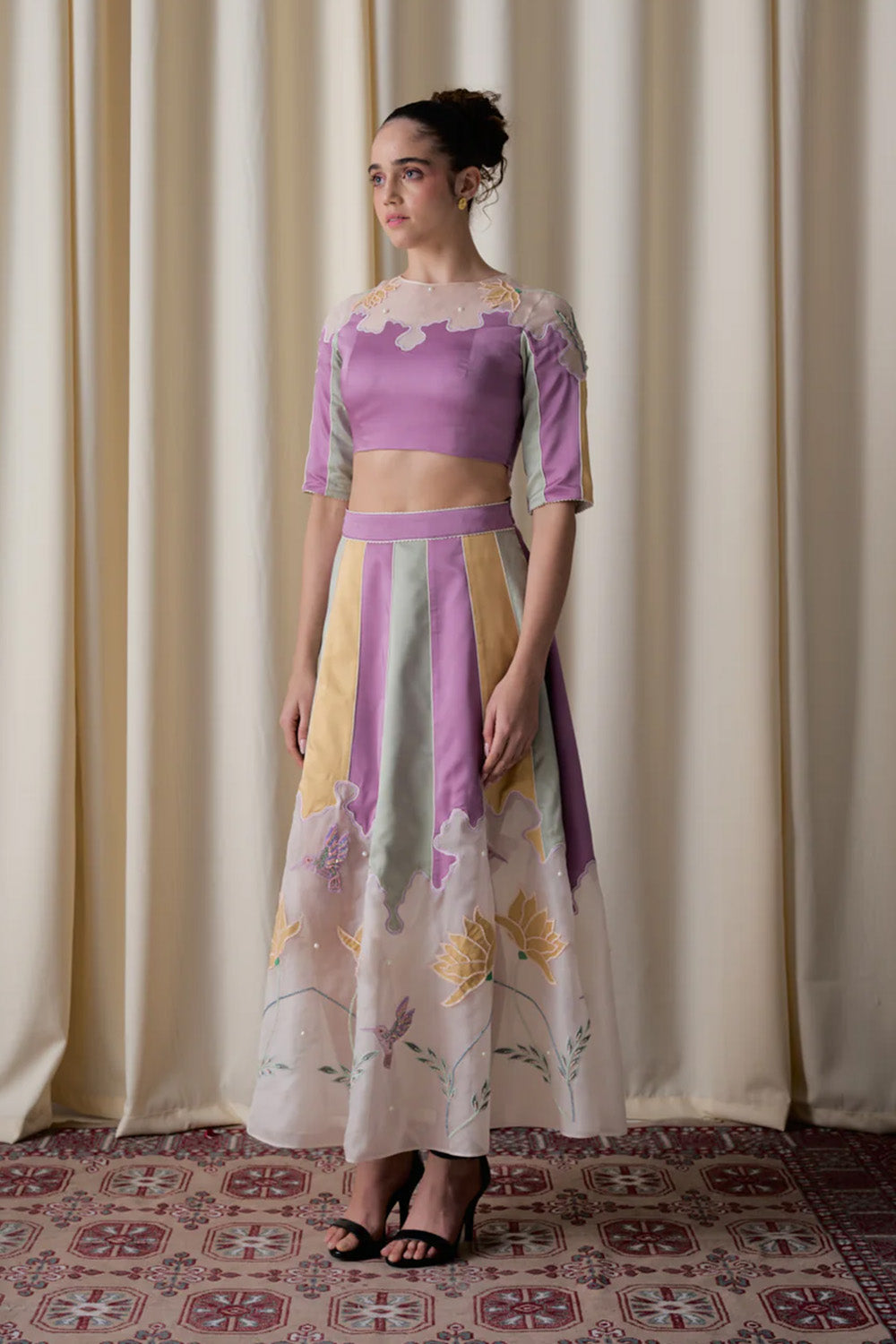 Delicately hand-embroidered organza with grace of fluid satin in this vibrant yet balanced creation. Intricate details bloom across sheer fabric, while the lustrous satin adds movement, creating a perfect harmony of color, texture, and elegance.