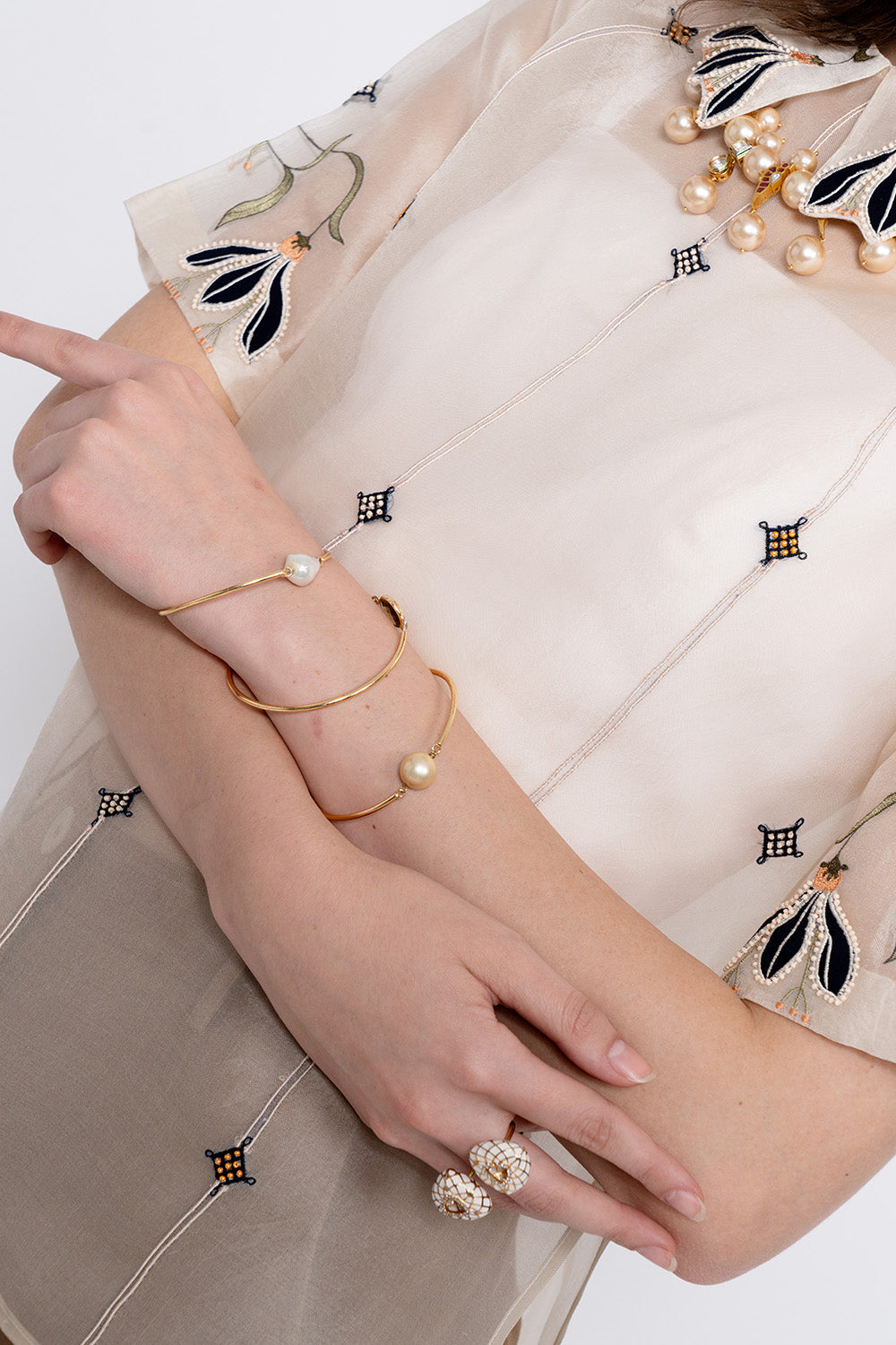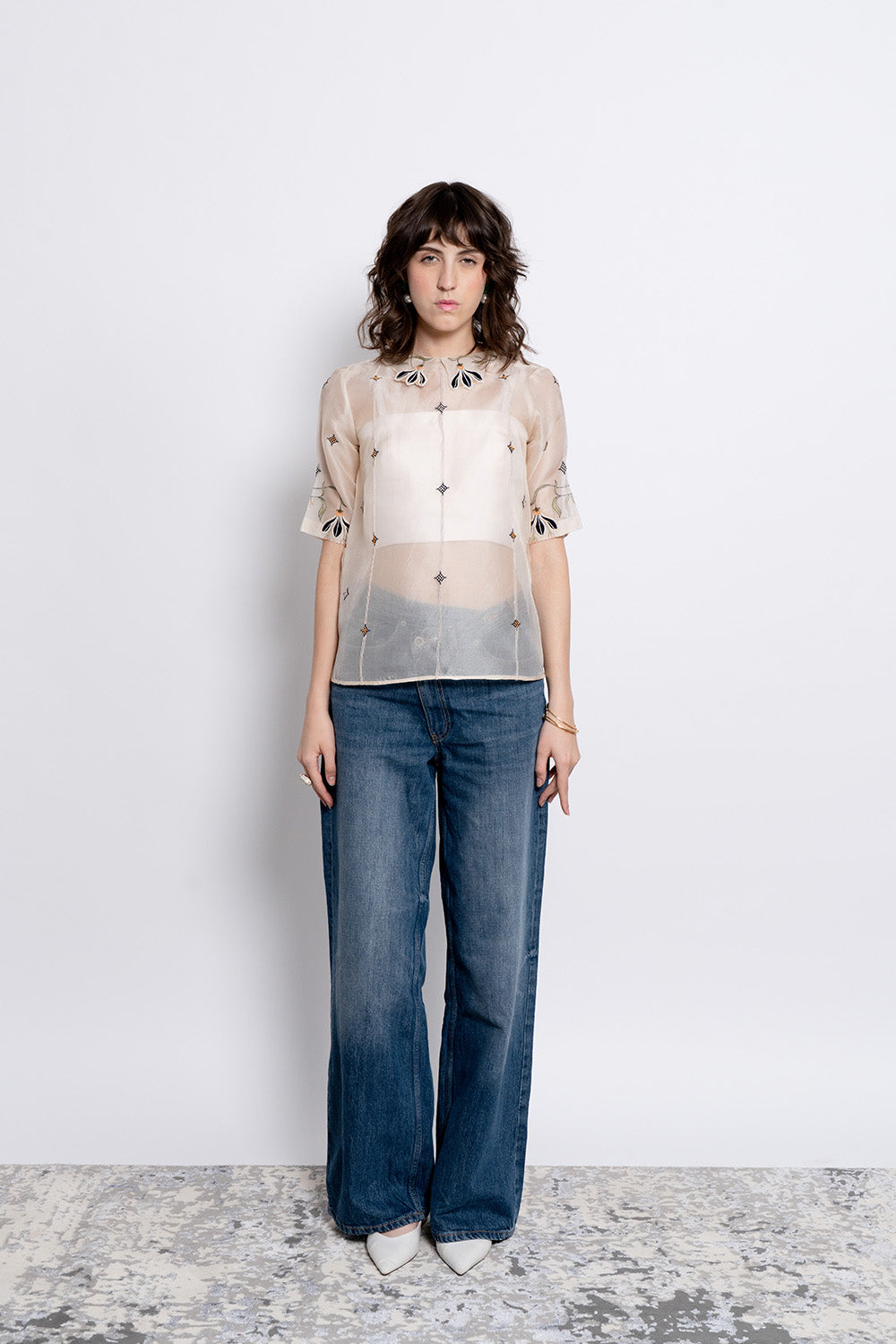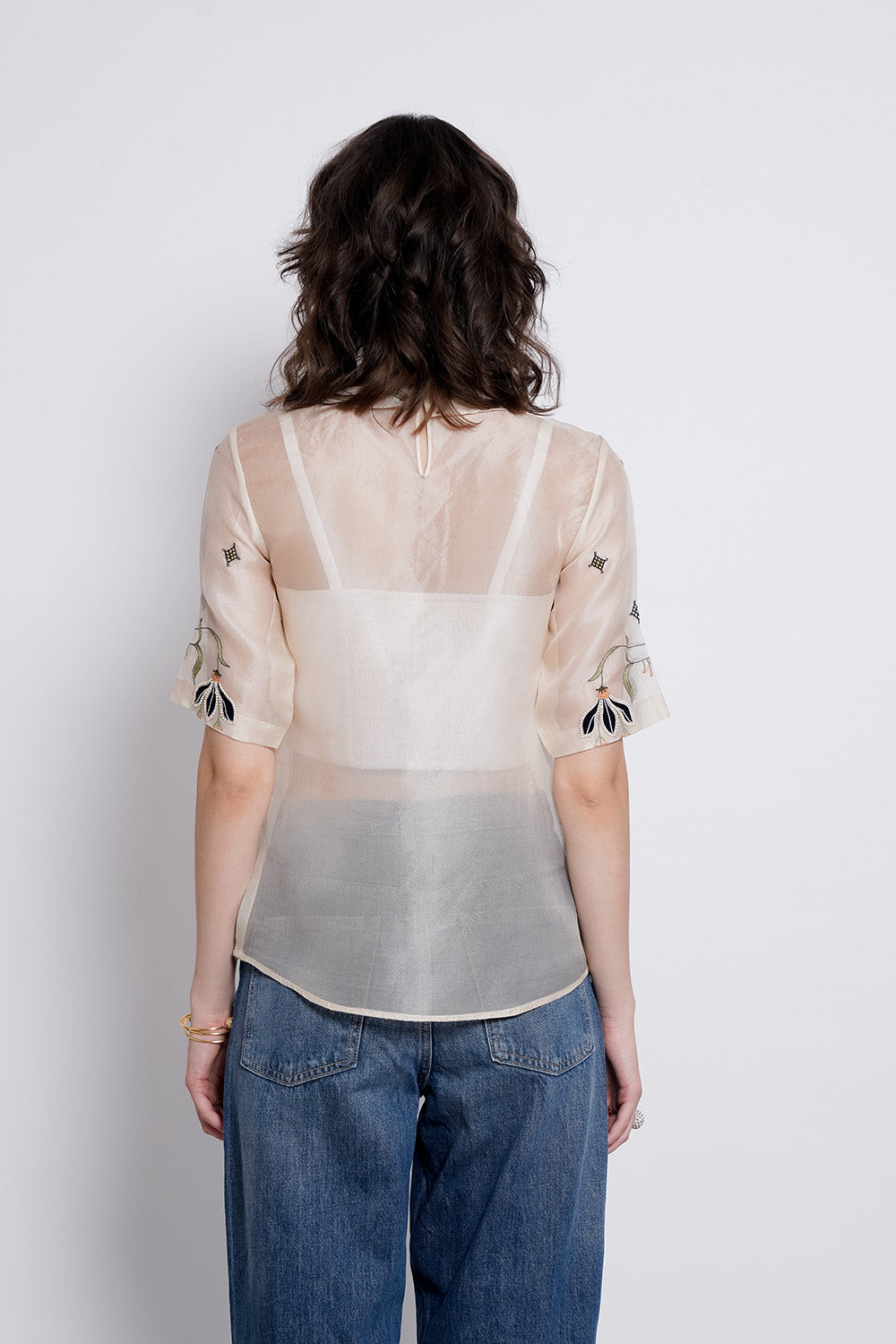 The Murki Top is an ivory silk organza shirt distinguished by a delicately embroidered floral collar that continues softly onto the sleeves. Fine vertical thread lines and small diamond-shaped embroidered motifs add texture and detail across the fabric. The silhouette remains refined and lightweight, bringing together delicate craftsmanship with an easy, elegant structure.