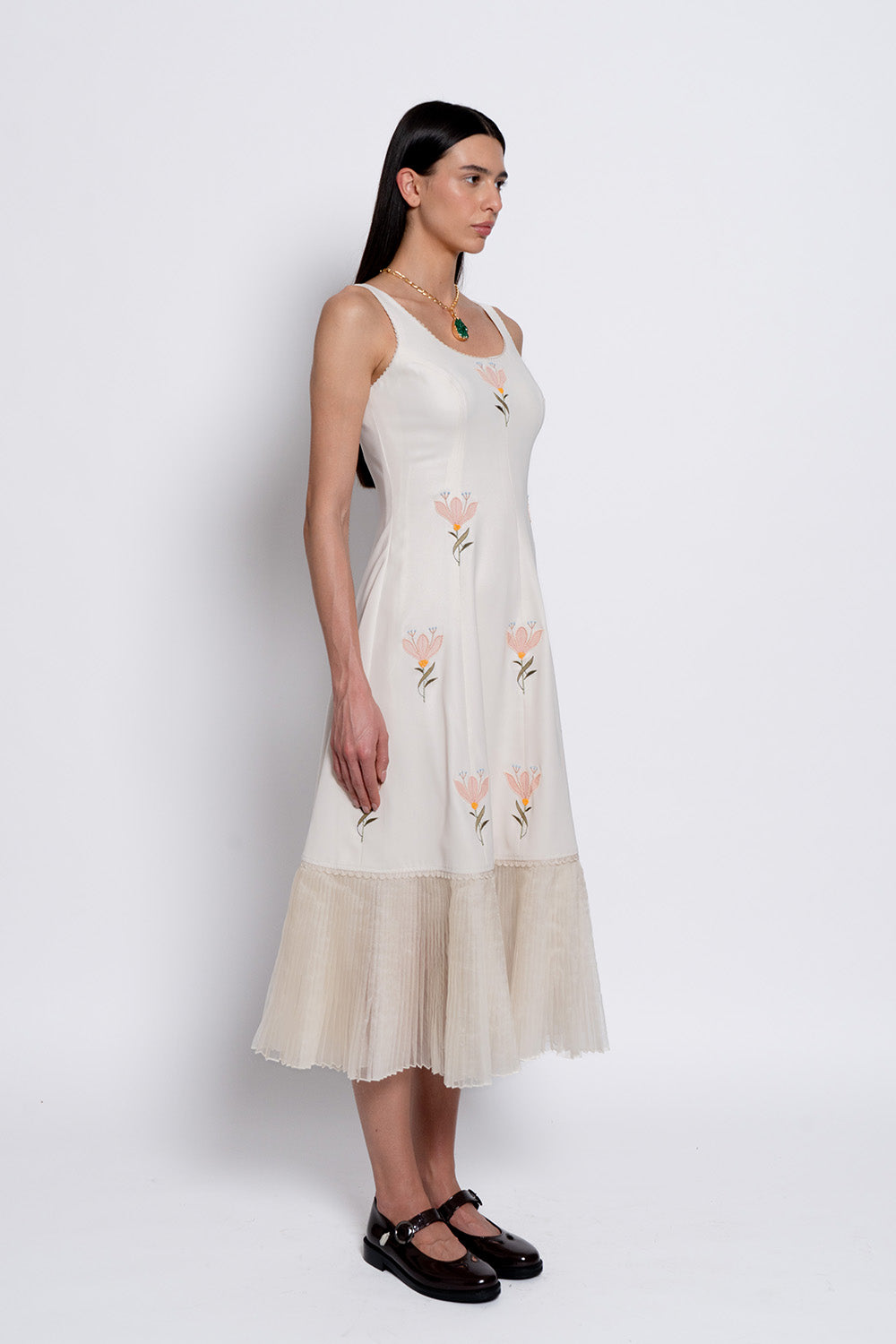 Nivāra is crafted in ivory premium crepe calf length dress, tailored through a fitted bodice and shaped by tonal piped panels that form a composed A-line silhouette. Delicate floral embroideries unfold with quiet precision, while tonal organza pleats soften the hem. Fine lace accents along the neckline, armholes, and panel hemline complete the piece with balanced restraint.
