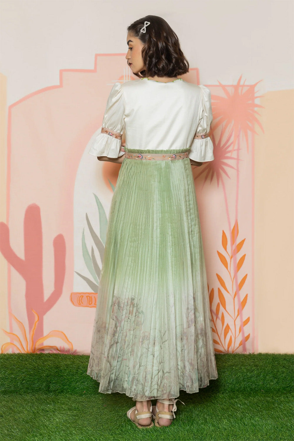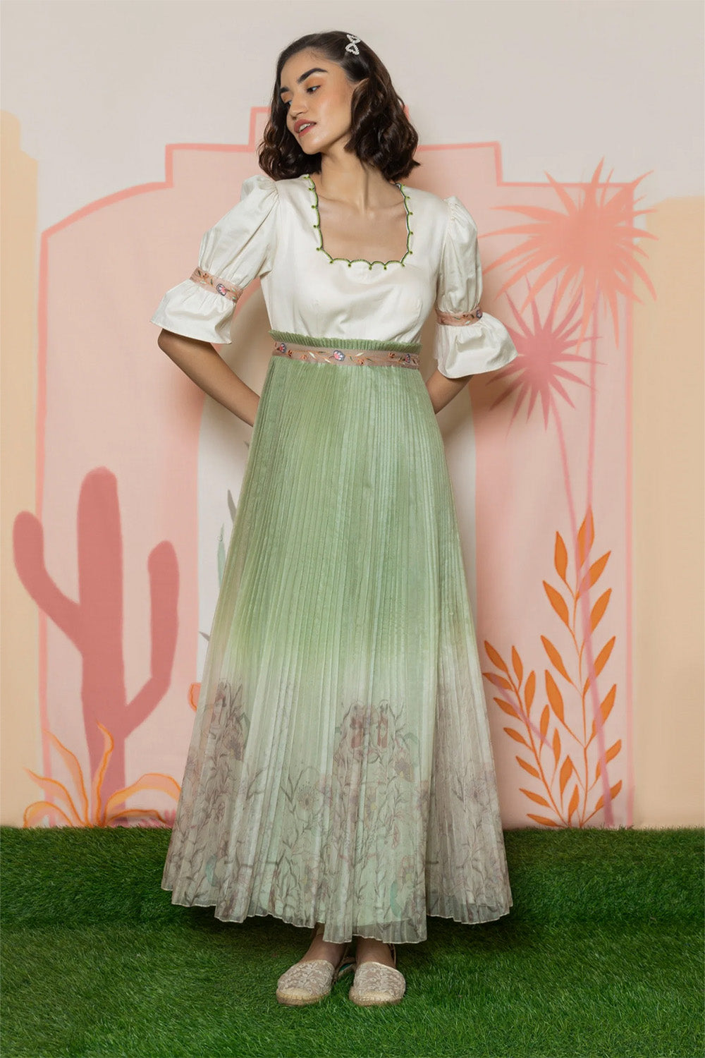An ombre coloured print-pleated skirt, complete with an off-white hand augmented bodice in a calf length dress.