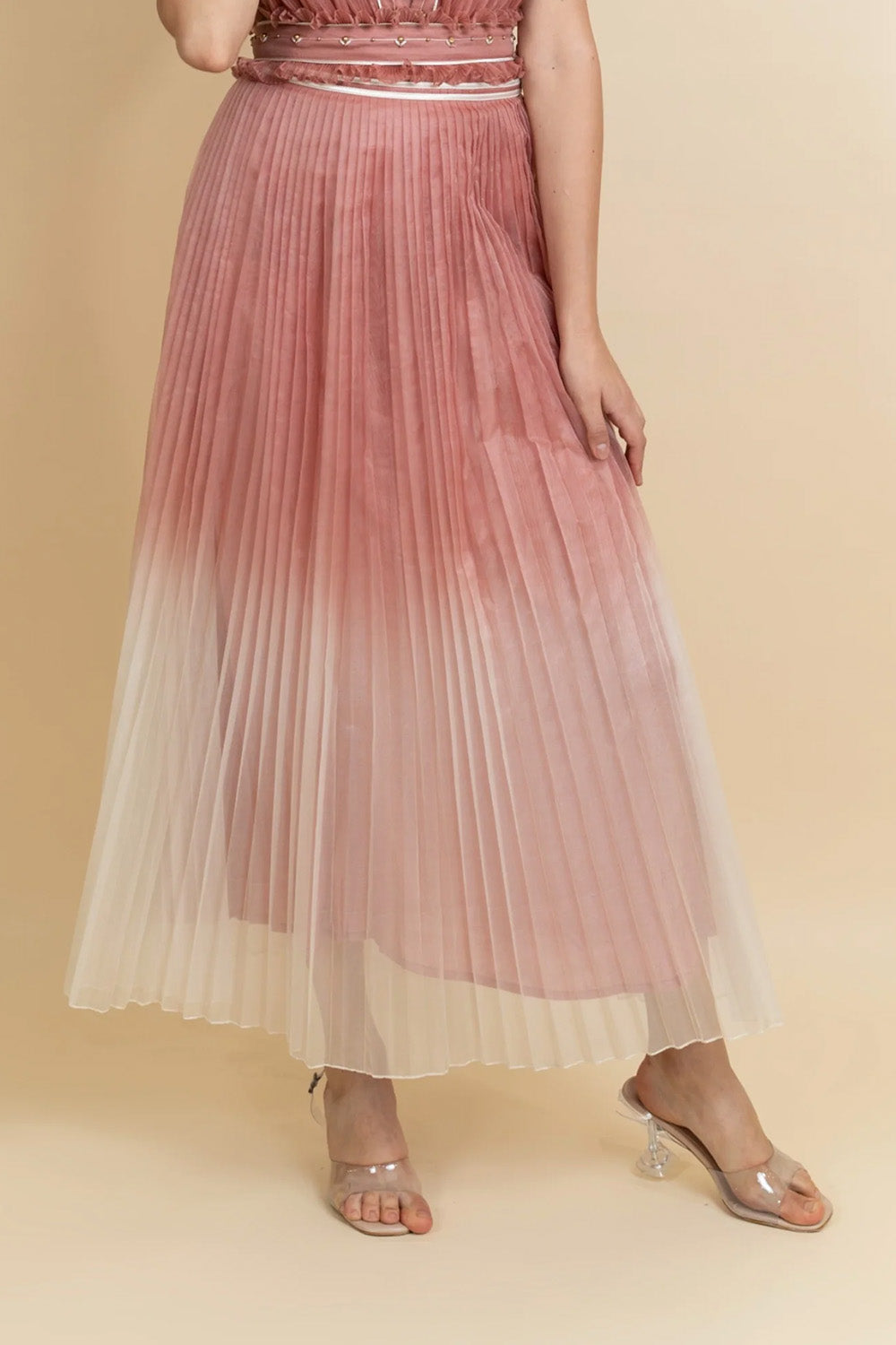 Pleated organza skirt in blush pink and ivory ombre with a side zip.